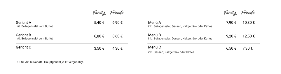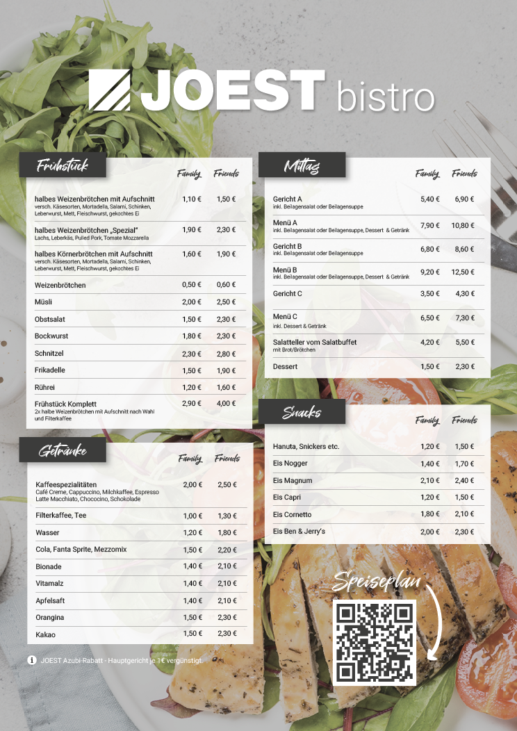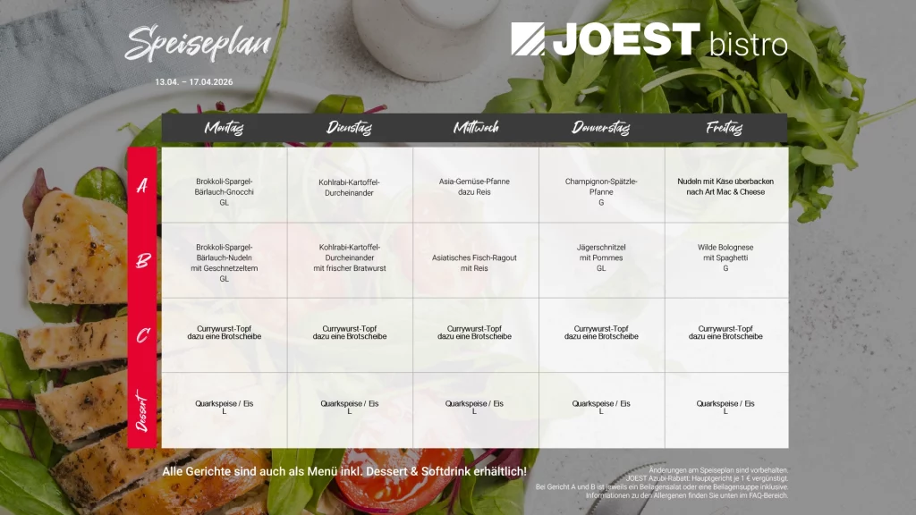 Für eine unkomplizierte Essensvorbestellung im JOEST bistro bitten wir Sie, Ihre Bestellung bis spätestens 10:00 Uhr am selben Tag aufzugeben.